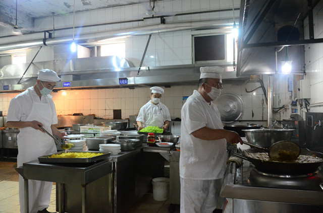 圖為職工食堂工作人員在為生產車間員工準備工作餐和分發粽子的情形。