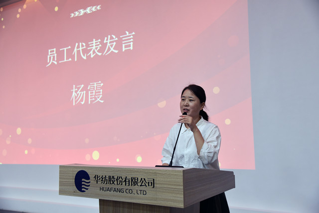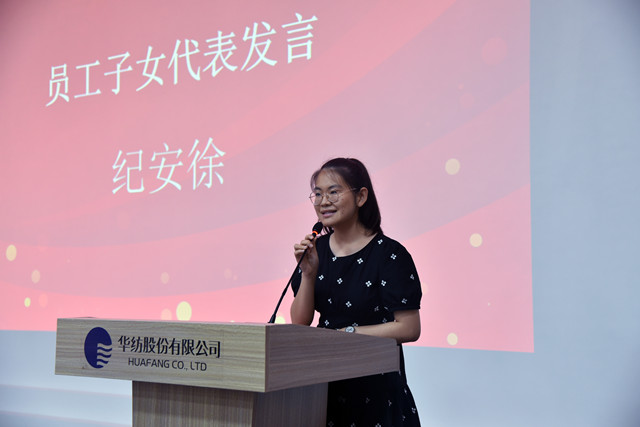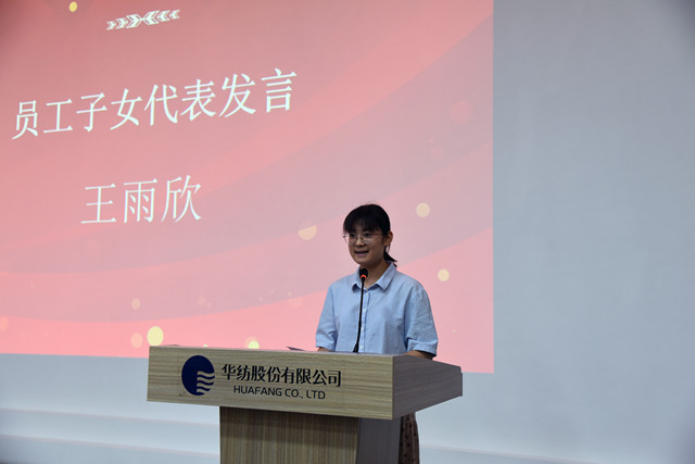 員工子女代表紀安徐、王雨欣在發(fā)言中,對家庭和公司表達了感激之情,并結合自身的學習情況談了個人的感受和對未來的憧憬。營銷管理部部長楊霞作為家長代表發(fā)言,她表示,公司對員工家庭的關心,讓大家深深感受到華紡大家庭的溫暖,也享受到了公司發(fā)展的成果。