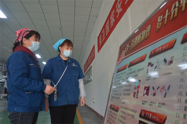 圖為公司家紡成品車(chē)間單針班兩名員工,在消防宣傳內(nèi)容前交流的情形。