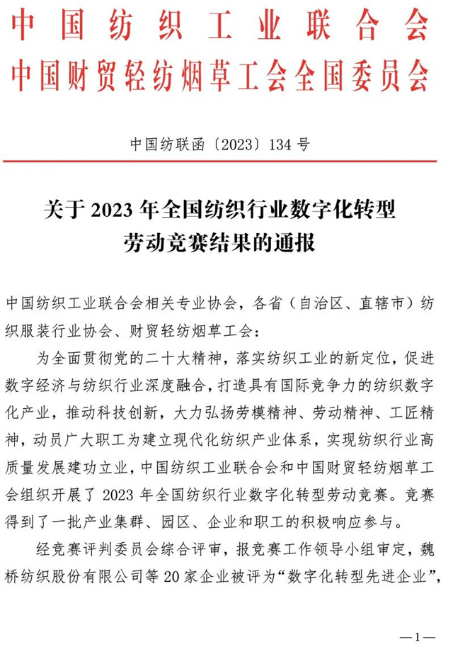 導讀:近日,中國紡織工業聯合會、中國財貿輕紡煙草工會全國委員會聯合發布了《關于2023年全國紡織行業數字化轉型勞動競賽結果的通報》,