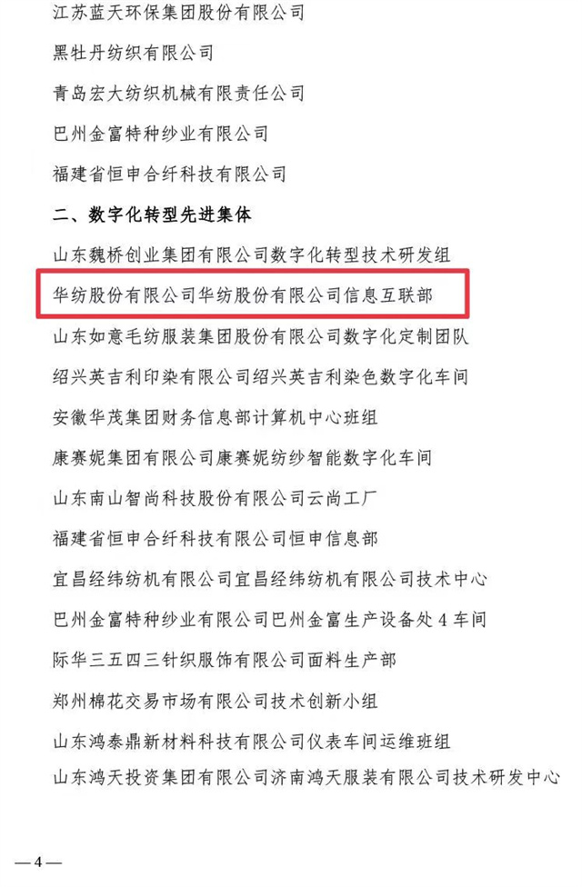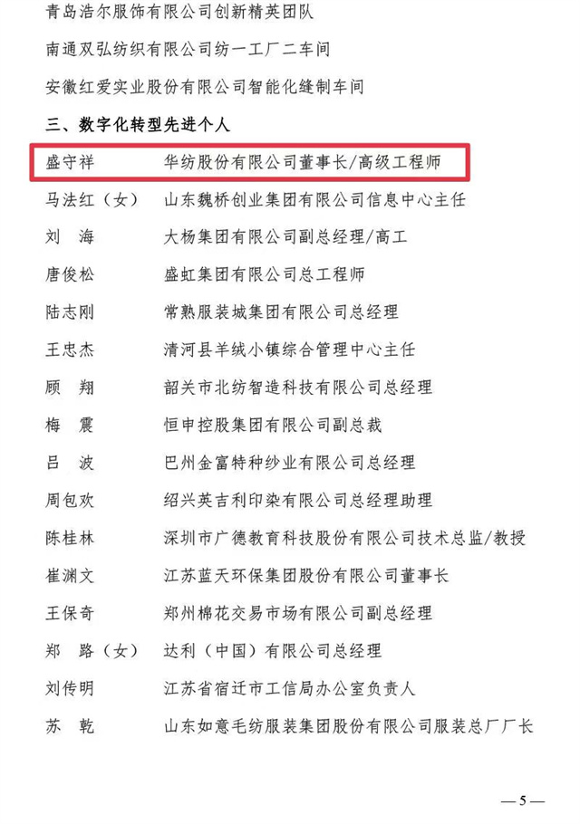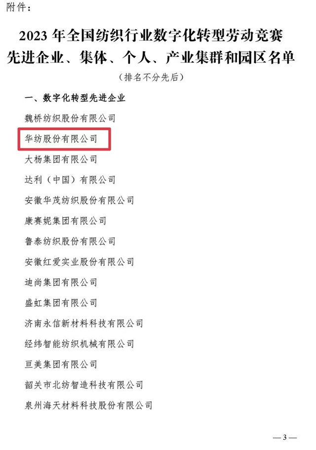 近日,中國紡織工業聯合會、中國財貿輕紡煙草工會全國委員會聯合發布了《關于2023年全國紡織行業數字化轉型勞動競賽結果的通報》,公司憑借2023年在數字化轉型方面的不斷探索與創新被評為“數字化轉型先進企業”,公司信息互聯部被評為“數字化轉型先進集體”,公司黨委書記、董事長盛守祥先生被評為“數字化轉型先進個人”。