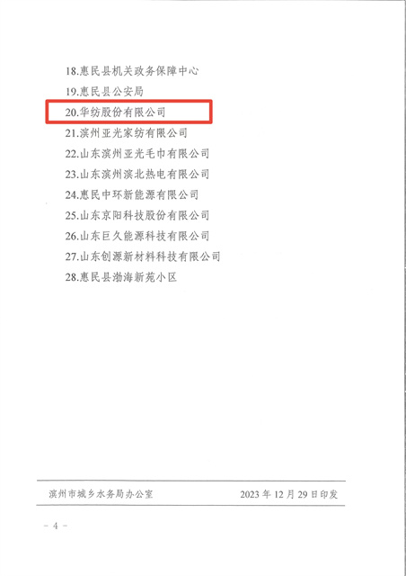 2023年,在全國紡織行業(yè)綠色發(fā)展勞動(dòng)競(jìng)賽中,公司榮獲節(jié)水標(biāo)桿企業(yè);在濱州市創(chuàng)建國家節(jié)水型城市省級(jí)復(fù)查工作中,公司高質(zhì)量、高標(biāo)準(zhǔn)完成各項(xiàng)工作任務(wù),為順利通過省級(jí)復(fù)查奠定了基礎(chǔ)。