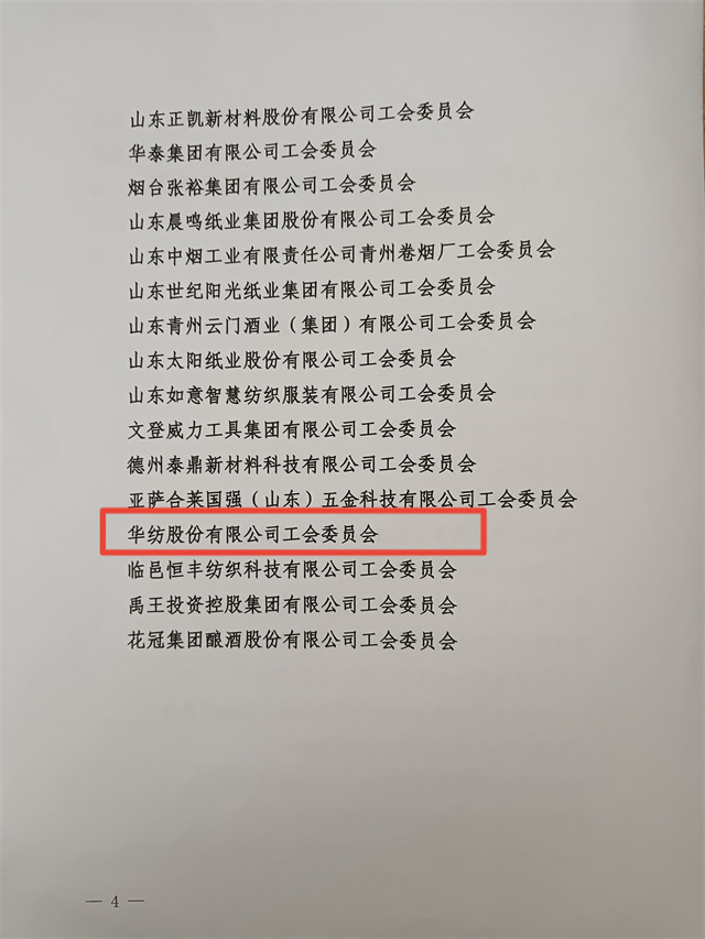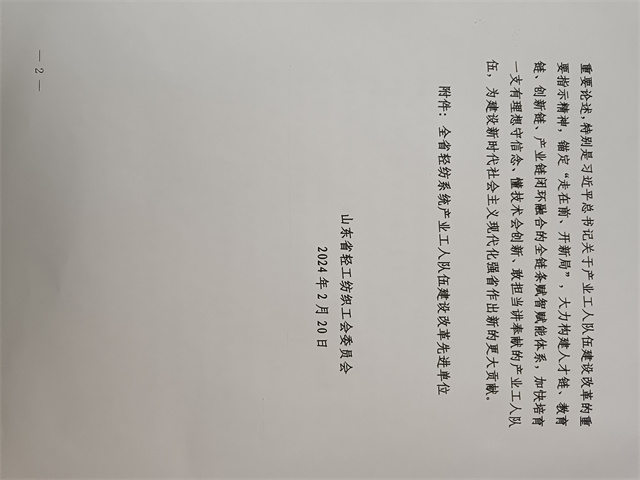 近日,省輕工紡織工會三屆四次全委會暨全省輕紡系統(tǒng)產(chǎn)業(yè)工人隊伍建設(shè)改革推進(jìn)會議在濟(jì)南召開。會上公布了全省輕紡系統(tǒng)產(chǎn)業(yè)工人隊伍建設(shè)改革先進(jìn)單位名單,公司工會委員會名列其中。